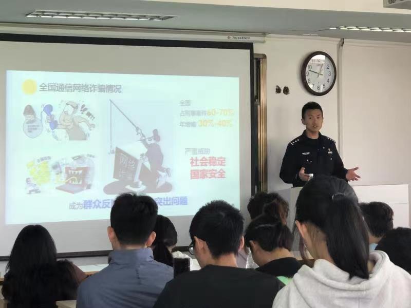 会上,许海龙针对近期校园诈骗的警情种类和特点,通过运用通俗易懂的语言向广大同学介绍了当前防诈骗工作的严峻形势。今年以来,全市发案类型以网络诈骗为主,在校大学生为主要受骗群体。70%的诈骗行为通过电话,微信,QQ等途径实施,常见的诈骗形式有冒充网购平台客服、兼职刷单刷信誉、交友聊天、短信链接等套路。许海龙采取以案说骗、直观易懂地方法对常见的诈骗类型和手法向同学们进行了详细讲解和剖析。诙谐的语言、生动的讲述、惊人的数字让同学们将预防诈骗的安全意识铭记在心,同时让同学们更加了解预防、应对这一系列新型诈骗的有效方法。