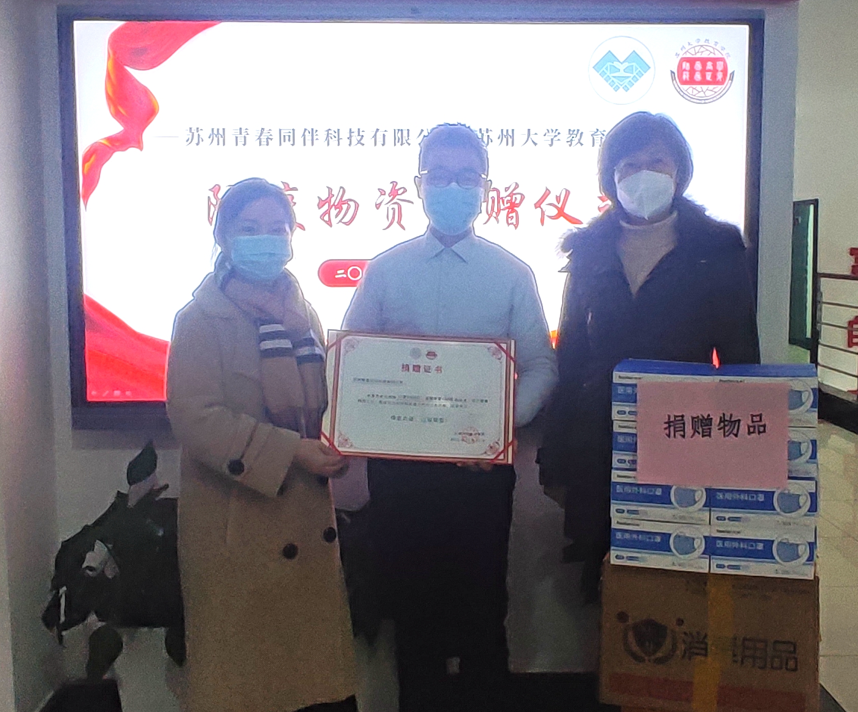 12月28日下午,校友单位苏州青春同伴科技有限公司向苏州大学教育学院捐赠了一批防疫物资,用点点爱心汇聚成了一股坚定的抗疫力量,为苏州大学抗“疫”助力。教育学院党委书记赵阳,党委副书记、副院长朱晨花,苏州青春同伴科技有限公司总经理陈龙玉参加了本次捐赠活动。