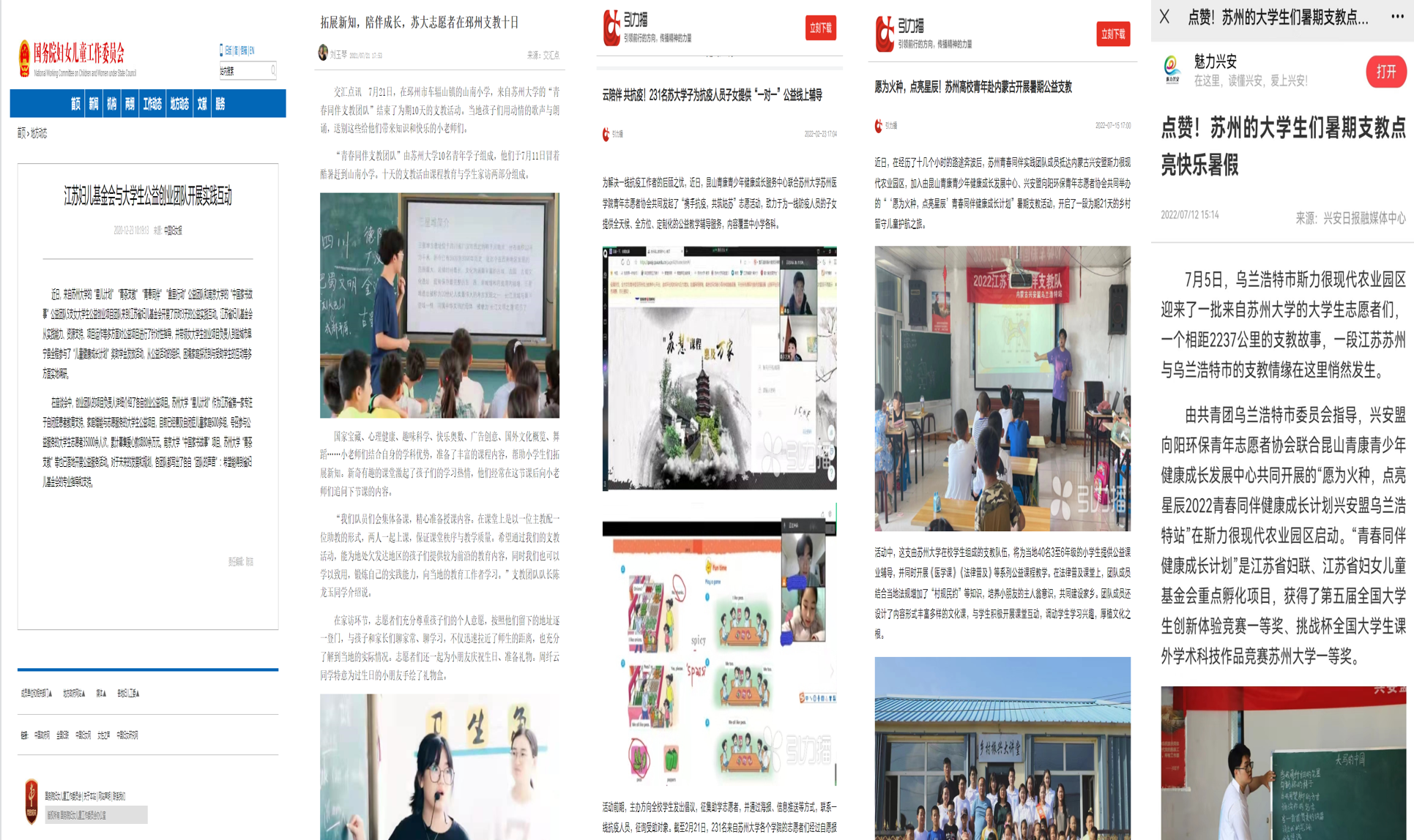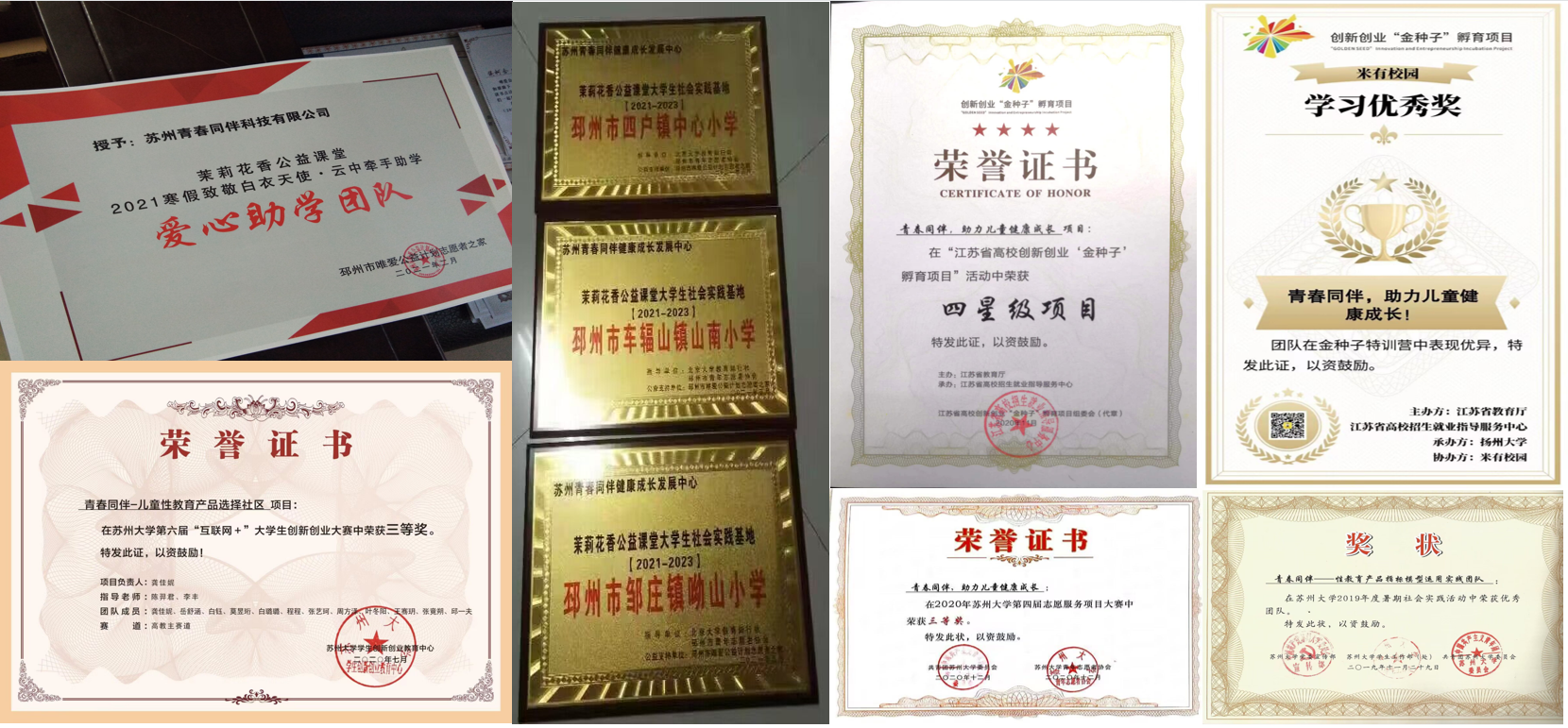 在创新创业的同时,苏州青春同伴科技有限公司深受苏州大学教育学院“学高为师,身正为范”院训的影响,潜心于国家的公益事业,彰显教育强国的初心和使命。“青春童伴”项目曾多次组建团队赴江苏邳州、内蒙古兴安盟等经济欠发达地区支教,改善当地教育资源配置不足的现状,助力儿童健康发展;2022年开展“携手抗疫,共筑姑苏”助学活动,为一线防疫人员子女提供全天候、全方位、定制化的公益教学辅导服务,传递青春公益力量。团队活动受到《中国妇女报》《交汇点》《苏州日报》《兴安融媒体中心》等媒体机构的关注报道。