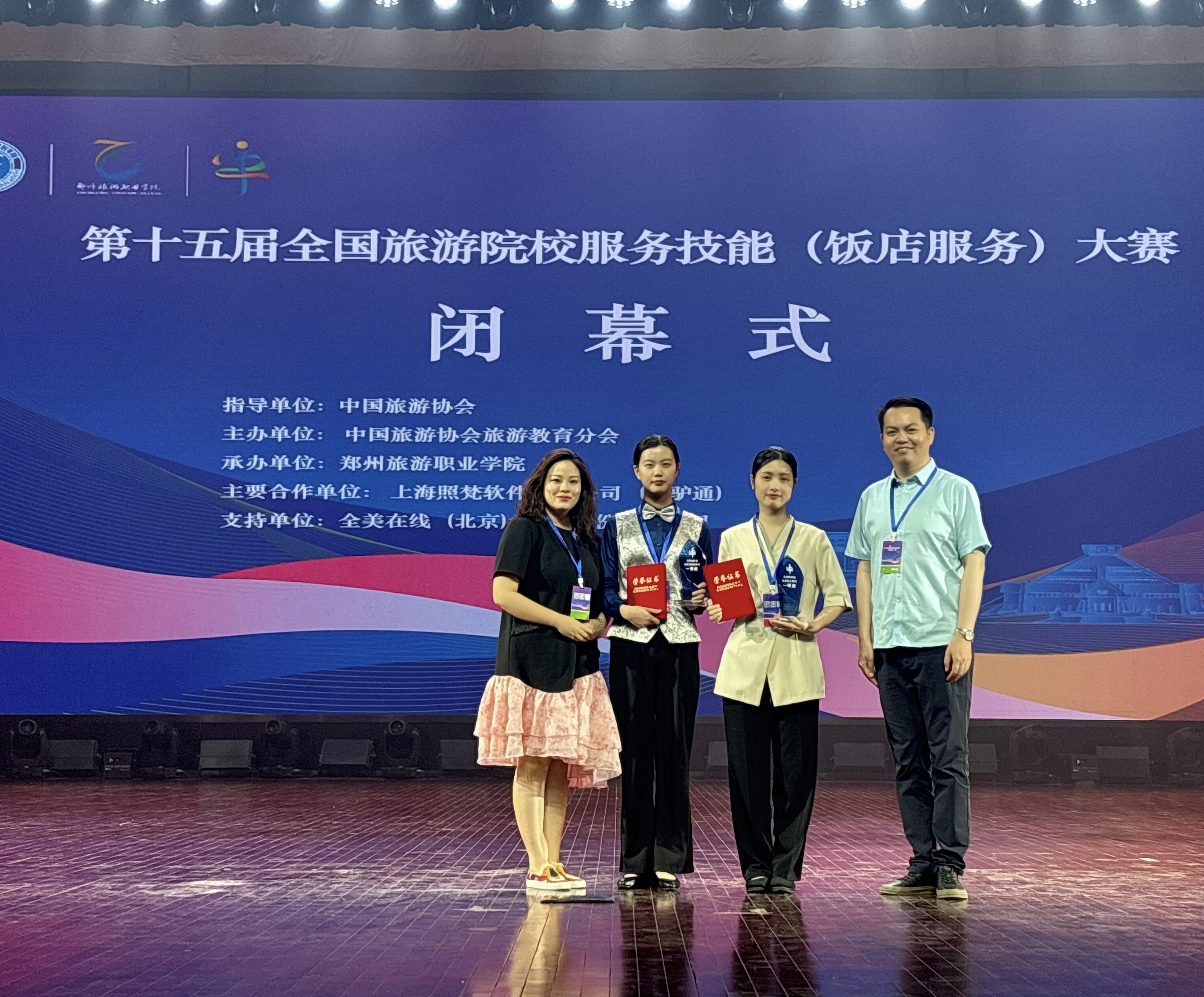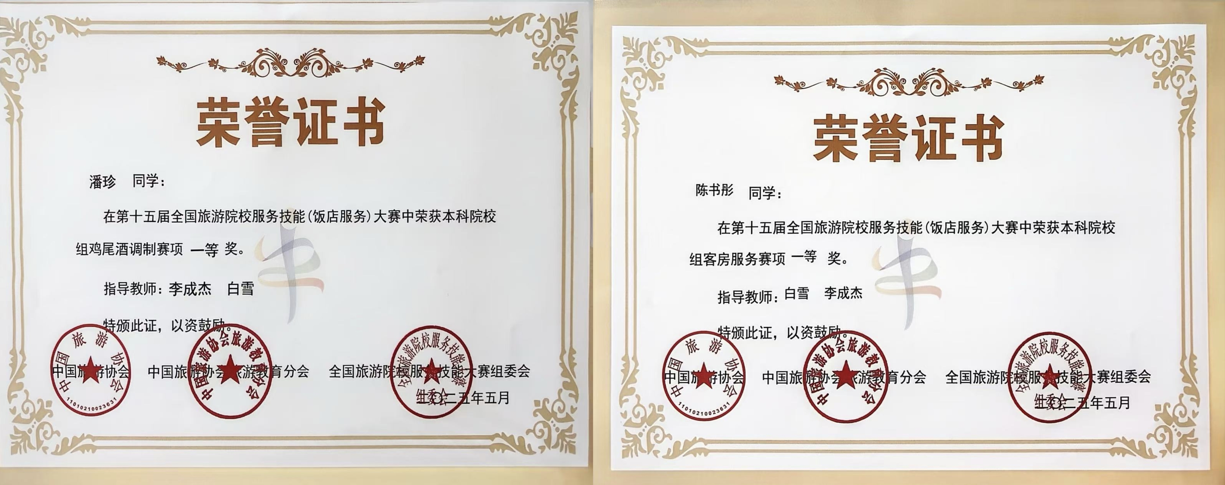 5月17日,第十五届全国旅游院校服务技能(饭店服务)大赛在郑州落幕。我校应用技术学院酒店管理专业的两名学子在比赛中取得佳绩。其中,由李成杰老师指导的2023级酒店管理专业的潘珍获本科组鸡尾酒调制赛项一等奖,由白雪老师指导的2023级酒店管理专业的陈书彤获本科组客房服务赛项一等奖。