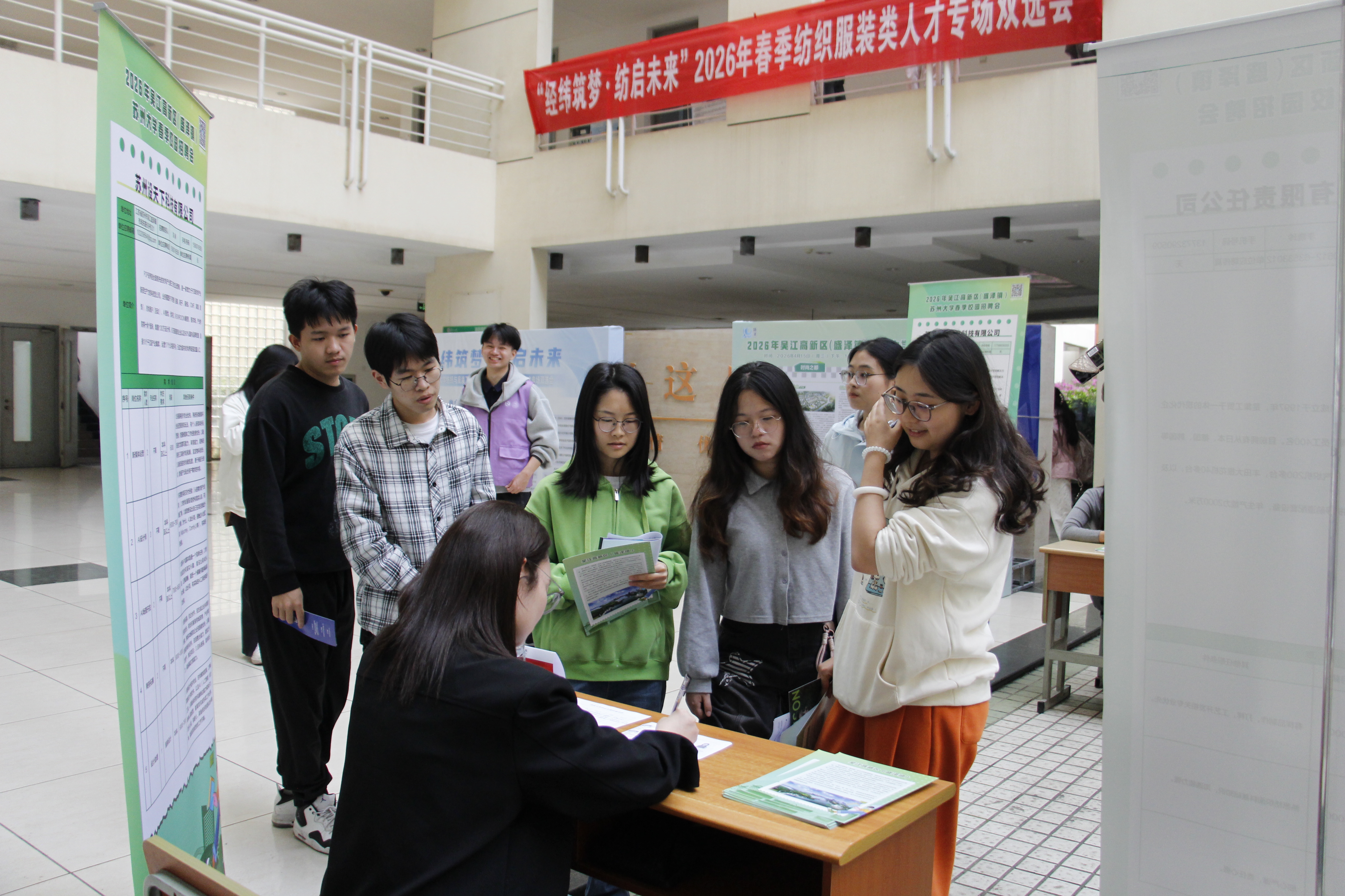 为助力纺织服装类毕业生实现高质量就业,搭建高效校企对接平台,4月15日下午,2026年春季纺织服装类人才专场双选会在北校区工科楼举办。本次双选会面向2026届应届毕业生及2025届离校未就业毕业生,共汇聚50余家优质企业。其中,吴江高新区(盛泽镇)人社部门组织辖区纺织企业组团参会、送岗上门。