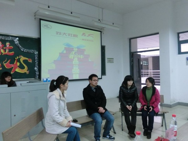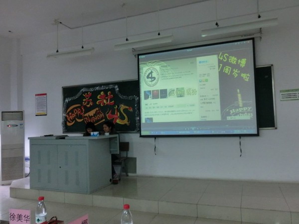 下午2点庆生会正式开始。首先是4S妈妈级人物--董娜老师致开场词,祝福微博一周岁生日快乐。4S微博管理员朱桦通过视频为大家作一周年工作汇报,让更多的人熟悉了4S微博的成长历程:“苏大社院4S”学生工作官方微博于