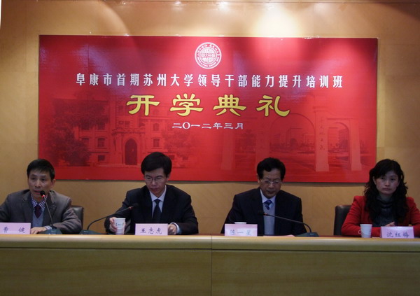 王志虎代表阜康市党政领导讲话。他强调,阜康市委、市政府高度重视这次培训工作,早在去年8月份市委就派他带队到苏大来考察,经过实地调研觉得苏州经济和社会发展的先进经验值得阜康学习。此次42名阜康党政领导干部是首批来苏大培训的精英,希望大家重视和珍惜这次难得的培训机会,通过听讲座、做调研,有所思、有所悟、有所得,把苏州最先进的理念带回新疆,助推阜康在新疆率先实现跨越式的发展。