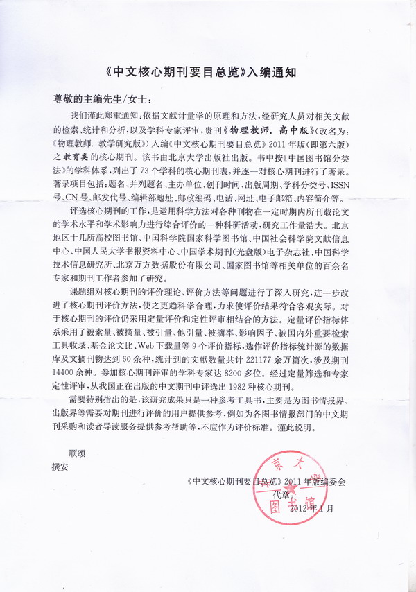 《中文核心期刊要目总览》是北京大学图书馆组织大量专家采用定量评价和定性评审相结合的方法,根据被索量、被摘量、被引量、他引量、被摘率、影响因子、被国内外重要检索工具收录、基金论文比、Web下载量等9个评价指标,结合5000多位科学专家的评审结果,通过对期刊的学术水平和学术影响力进行综合评价,从14400余种期刊中评选出73个学科的1982种核心期刊。物理科学与技术学院主办的学术期刊《物理教师》能成功入选,体现了我校学术实力在不断提升,影响力在不断扩大。