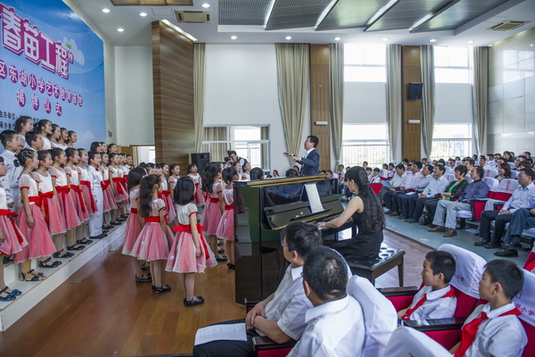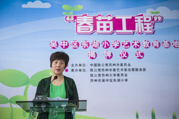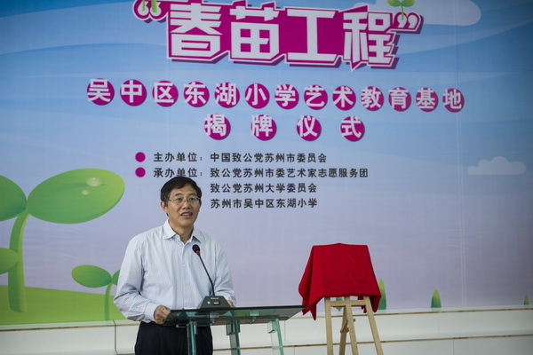 为深入贯彻落实中国共产党十八届三中全会精神和中国致公党十四届二中全会精神,开展坚持和发展中国特色社会主义学习实践活动,充分发挥苏州市致公党员的人才智力优势,2013年致公党苏州市委、致公党苏州大学委员会组织了苏州大学艺术学院、音乐学院的致公党员成立了致公党苏州市委艺术家志愿服务团,开展了一系列以“文化惠民、文化为民、文化乐民”为宗旨的“春苗工程”文化艺术志愿服务活动。志愿服务团成立以来,多位来自我校艺术学院、音乐学院的志愿团成员积极参与“春苗工程”活动,其中有在20多个城市建造了50多座雕塑的现代雕塑家、艺术学院沈建国老师;有2015年苏州世乒赛会徽的设计者、艺术学院张大鲁副教授;有青年指挥家、吴侬女子合唱团指挥、音乐学院李长松老师等,这些在各自专业领域颇有建树的艺术家多次来到吴中区东湖小学,实地考察该校艺术教育现状,对该校艺术老师进行多层次的艺术指导与交流,组织指导音乐、美术、陶艺等学生艺术社团,举办艺术讲座,拓展学生艺术视野,指导学生的各类艺术创作,加强校园文化建设。揭牌仪式中,展示了由致公党艺术家辅导的学生绘画、书法、陶艺、合唱、舞蹈、钢琴演奏等作品。