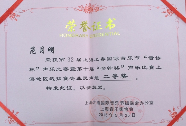 近日,第32届上海之春“音协杯”暨第十届“金钟奖”上海赛区选拔赛声乐大赛落下帷幕。本次比赛由上海之春国际音乐节组委会和上海音乐家协会主办,比赛为期两周。我校音乐学院2012级学生范月明参加了比赛,并获得二等奖。