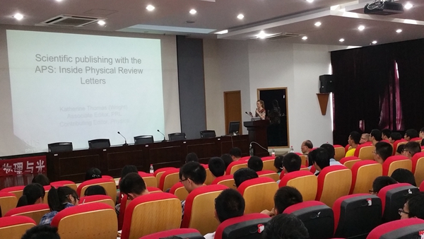 开幕式结束后,国际著名期刊PRL编辑Katherine Ruth Thomas为同学们作了题为《scientific publishing with the APS:inside physical review letters》的报告。