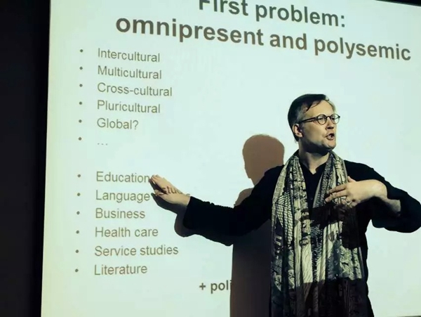 首先,Dervin教授介绍了几种当下对于跨文化概念比较新颖的阐释,指出今日的跨文化从理想化角度而观,已经与过去的观念有所不同,但是却承载着以往的观念,并与之有许多相似之处。接着他提出了两个问题:什么是跨文化?如何定义跨文化?并就这两个问题论述了其此次讲座的具体内容。Dervin教授首先指出,跨文化概念的“无处不在”以及“多义词”的两个特性,进而指出现存的‘跨文化’的“多义”定义的不同特性,如交流互动性,多元性,交叉性,复元性,整体性等等。他进一步指出,“跨文化”概念渗透在教育、语言、文学、商业学、健康、服务等领域。在跨文化研究中,人们更多地引用商业和政治的概念,导致对于跨文化的定义并不清晰,甚至有些过度泛化。他引用了庄子的“名者,实之宾也。”表达了其对于目前跨文化定义之含糊现象的批判观点与态度。Dervin教授继而聚焦于人口流动、商业交流、世界化宗教等方面进一步阐明:文化的多元性、交流性、互相影响性,并指出,文化如语言,存有发展、演变等特性。