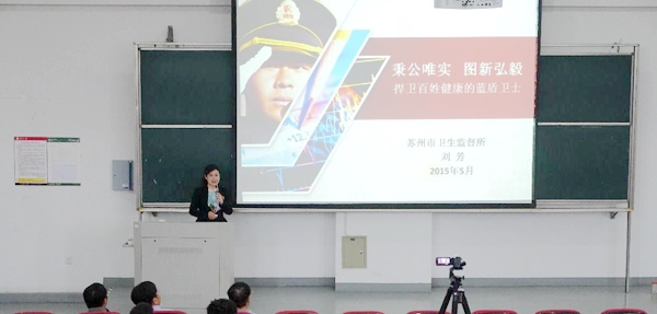 在随后的讲座中,刘所长首先展示了苏州的基本情况和苏州卫生监督的现状。目前苏州市三级卫生监督网主要由苏州市卫生监督所、10个区县卫生监督所和65个乡镇卫生监督所为执法部门构成,全市卫生监督人员编制数722人,助理监督员177人,兼职卫生监督协管员1657人,以11部法律、39个管理条例和22个省市地方法律法规作为执法保证,以苏州市32937家餐饮单位、3007家医疗机构、61051名卫生技术人员、20325家公共场所、3000余家生活饮用水、二次供水单位、1038所学校、576家托幼机构、496家放射诊疗机构、152家涉水产品生产机构以及129家消毒产品生产机构为监督对象。在任务繁重、人员数量不足的情况下,如何依法行政,有效做好卫生监督工作,提高全市卫生水平是卫生监督部门所面临的重要挑战。刘所长针对人力资源建设和执法行为的规范做了重点介绍:推行学分管理制度,开展“三基”考试,外聘专家作为业务顾问,鼓励员工进行在职教育,开展“育林”带徒工程,加强卫生监督稽查和信息化建设等措施来建设和提升执法能力是卫生监督的核心基础;做实与拓展卫生行政许可,打击非法行医、学校卫生监督等是卫生监督的重要内容;以联动共进为目标,铸造卫监风采,树立与宣传卫监正面形象,是卫生监督的有效手段。通过张家港市金港镇人民医院对“外出租承包骨科案”和酒店非法添加“酸性金黄”等具体案例分析,向台下师生展示了卫生监督和依法监督的重要性。