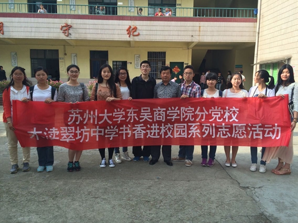 当天下午四点活动圆满结束。木渎翠坊中学的孩子们依依不舍,与志愿者们合影留恋。在今后的日子里,可爱的志愿者们,还有更多热心的苏大学子们,会将爱传递下去。真心希望那些孩子能在志愿者们的努力帮助下积极进取,通过读书改变命运!