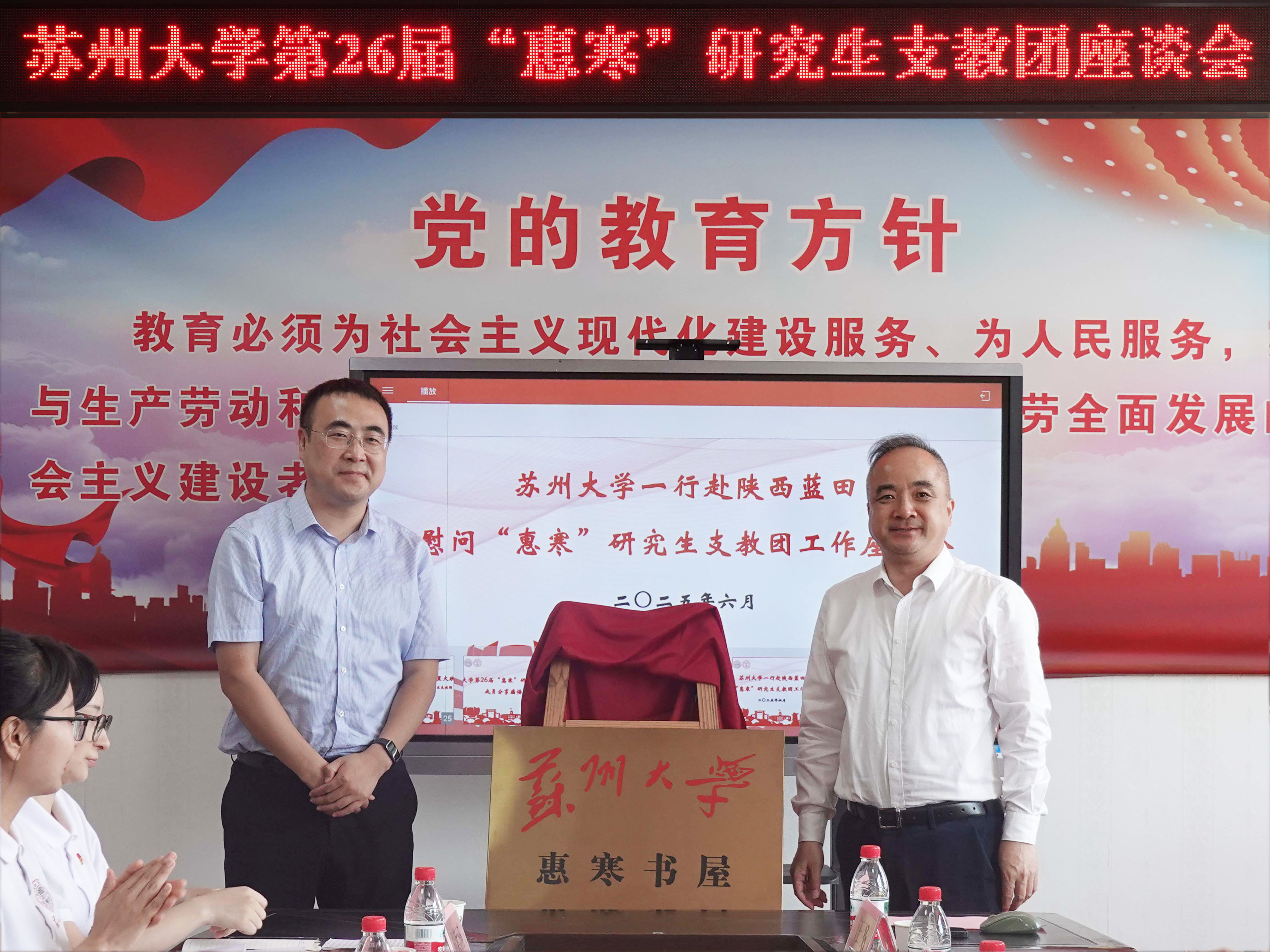 为传承“惠寒”精神,扎实开展“青春年少好读书”活动,帮助服务地青少年拓宽视野、营造向善乐学的浓郁氛围,我校在第27所“惠寒”学校蓝田县普化镇韩河小学捐建“惠寒书屋”。查佐明和靳攀共同为苏州大学“惠寒书屋”揭牌。我校文学院“苏小葵种书计划”项目与王健法学院携手“童”行团队分别向“惠寒书屋”捐赠图书300册。