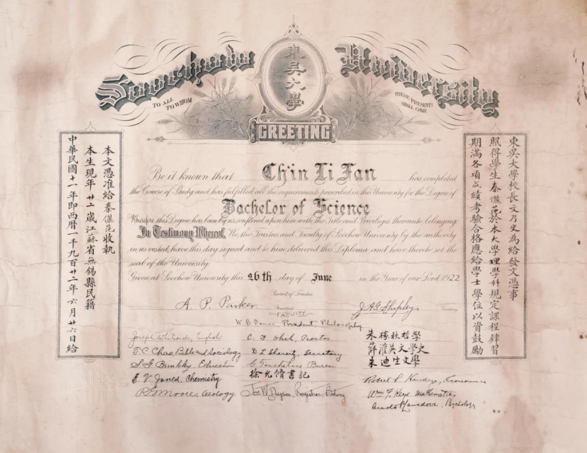 摊开证书,百年光阴仿佛就在眼前。纸页虽泛黄,字迹却清晰有力,学位证书右侧中文是:“东吴大学校长文乃史为给发文凭事 照得学生秦俪范于本大学理学科规定课程肄习 期满各项成绩考验合格应给学士学位以资鼓励。”学位证书左侧中文是:“本文凭准给秦俪范收执 本生现年廿二岁 江苏省立无锡县民籍 中华民国十一年即西历一千九百廿二年六月廿六日给。”