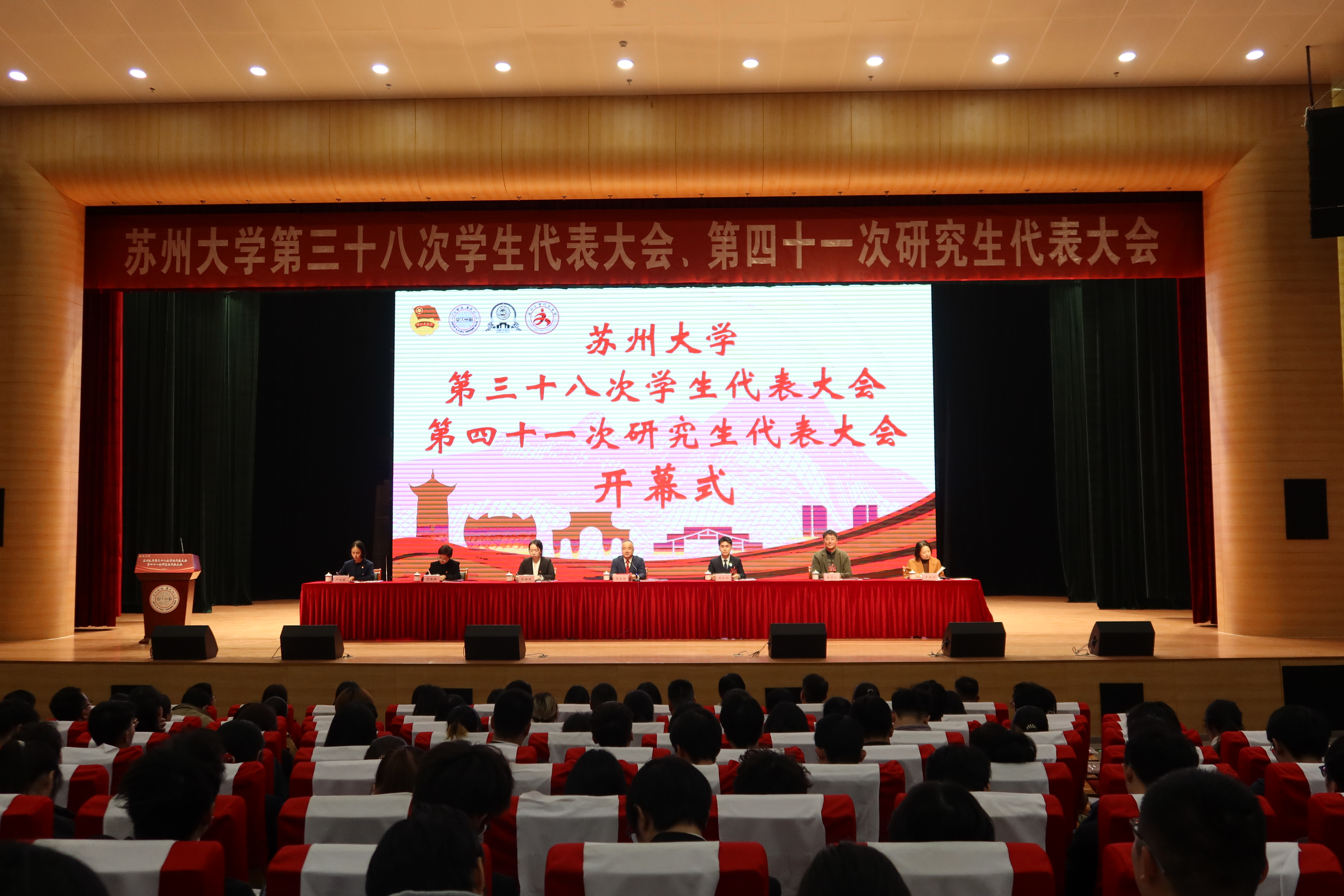 11月23日,苏州大学第三十八次学生代表大会、第四十一次研究生代表大会在天赐庄校区召开。校党委常委、副校长查佐明,省学生联合会驻会执行主席张知恒,市学生联合会驻会执行主席朱娅妮,我校团委书记于潜驰,党委学生工作部(处)部(处)长董召勤,党委宣传部副部长尹婷婷,各学院(部)学生会、研究生会秘书长及来华留学生代表出席开幕式。277名本科生代表、190名研究生代表参加大会。开幕式由校团委副书记严韵致主持。