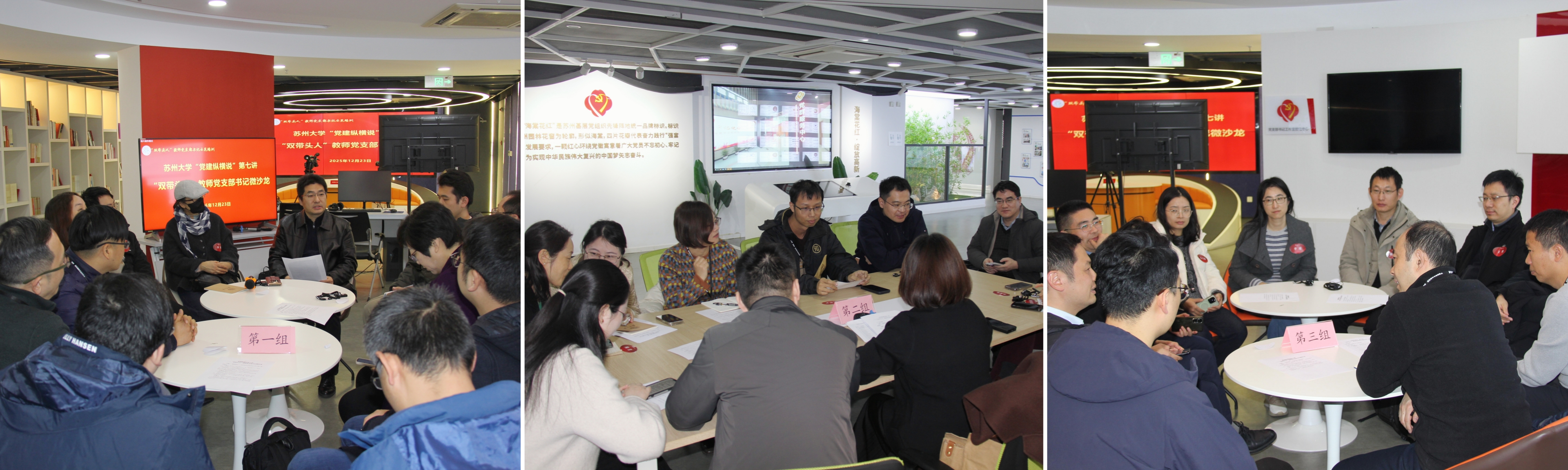 苏州医学院心血管研究所党支部书记胡士军、马克思主义学院教师第四党支部书记胡绿叶、纺织与服装工程学院教师第二党支部书记方剑结合工作实际,围绕党建赋能科研攻关、主题党日开展、党建工作法凝练等方面分享经验,为大家提供了建强高校教师党支部的理论养分和实践样本。