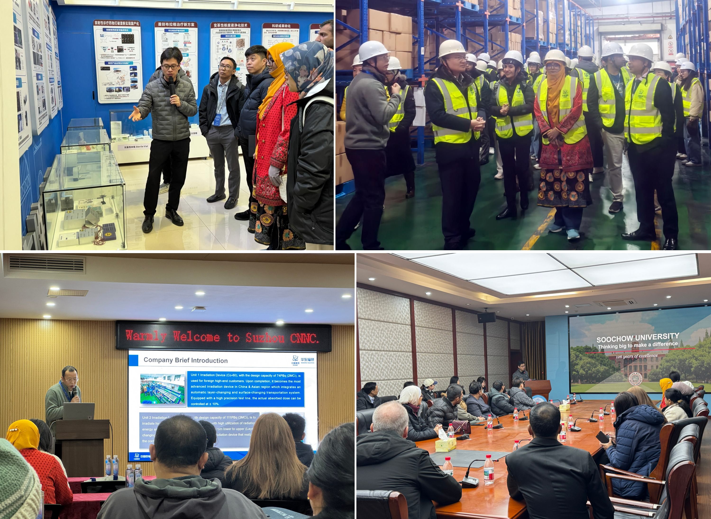 除室内教学外,培训班还安排了实地参访,为各国学员提供了从基础科研、临床转化到产业应用的全链条视角。学员们先后走进我校放射医学与辐射防护国家重点实验室及苏州中核华东辐照有限公司,拓展了对核技术跨领域价值的认知。