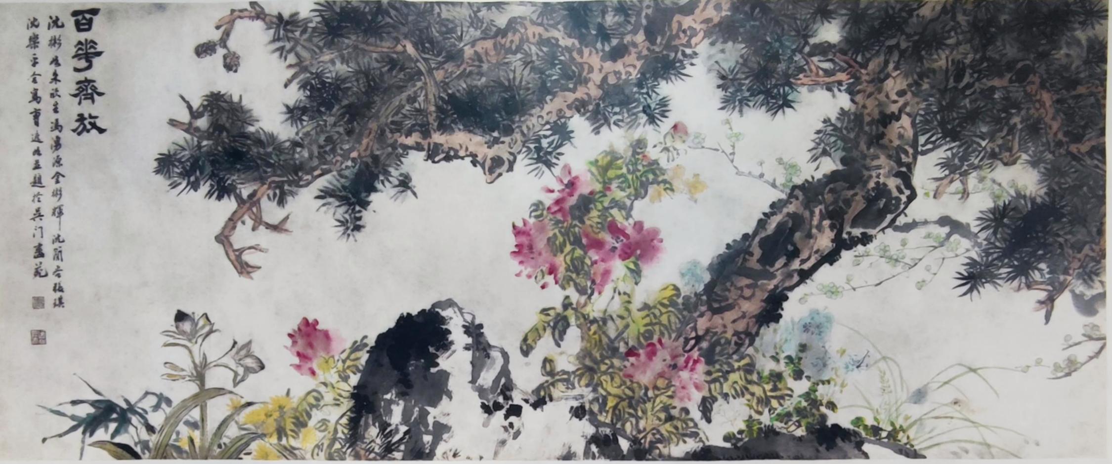 展品背后蕴藏的苏大故事更是令人动容。朱敬文手书《韦氏字典来源记》及朱恩馀捐赠的英汉双解《韦氏大学字典》,见证了一个教育世家对知识传承的敬重。顾浩、周秦、程正迪等校友捐赠的钱仲联诗词手迹、钱君匋书法立轴等藏品,生动诠释了校友对母校文脉反哺的深情。此外,由沈彬如、朱欣生、冯涌源、金彬辉、沈简谷、张琪、沈乐平等多位苏州画家合作,曹逸如题字的六尺巨幅画作《百花齐放》,原陈列于苏州医学院可园水榭厅堂,2013年入藏博物馆,画面尽显春日生机与文人雅趣。展览还特别展出了东吴大学首任华人校长杨永清的珍贵信札,这些信札为研究学校早期办学历史提供了第一手的档案史料。