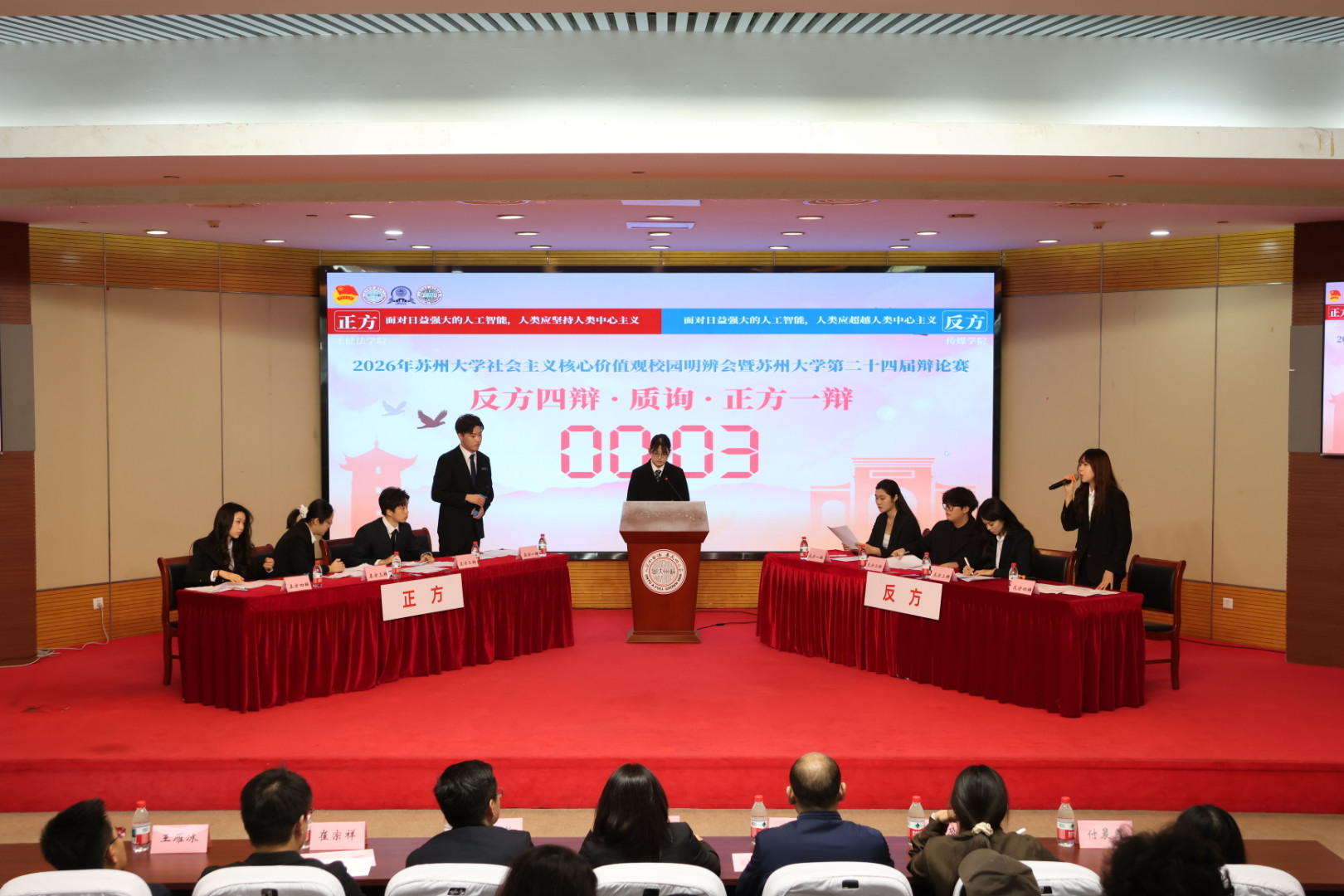 自3月14日首场小组赛至今,共有来自各学院(部)的26支辩论队聚焦人工智能、个人成长等命题,紧扣时代脉搏,在唇枪舌剑中明辨真理,在思想交锋中不断成长。正反双方在立论、质询、自由辩论等环节,围绕“搭子社交让当代年轻人更孤独/更不孤独”“AI的迅猛发展提升了/降低了人类创作者存在的意义”“面对变乱交织的世界,‘求稳’应当/不应当成为青年的人生态度”等问题进行深入剖析,展现出新时代苏大青年敏锐的问题意识与扎实的思辨能力。