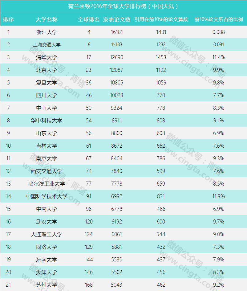 本次莱顿大学排行榜共有842所全球大学上榜,中国高校有133所,其中中国大陆有108所,中国香港6所,中国台湾地区19所,澳门地区没有高校上榜。苏州大学世界排名168,国内排名21,省内排名3。