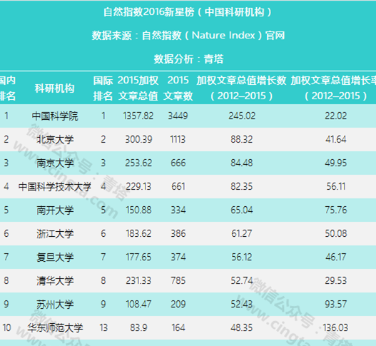 自然指数2016新星榜增刊旨在展示那些高质量科研论文增长最显著的国家和机构,排序依据的是它们在2012~2015年间对自然指数绝对贡献值的变化。自然指数追踪的是全球8000多家机构在68种高质量自然科学期刊上的论文发表情况。在全球100家科研产出增加最多的科研机构中,有40家来自中国,其中包含39所高校。中国科研机构中,共有24家自2012年以来的增幅超过50%。美国作为全球高质量科研论文的第一大贡献国,在榜单上居第二位,有11家科研机构进入100强之列。英国和德国分别有9家和8家机构上榜。40家进入百强的中国科研机构中,中国科学院位居全球高质量科研产出增加最多的100家机构之首,另外8家中国机构紧随其后,分别是北京大学、南京大学、中国科学技术大学、南开大学、浙江大学、复旦大学、清华大学和苏州大学,以上9家科研机构也占据了本次2016自然指数新星榜Top100的前九位,表现亮眼。